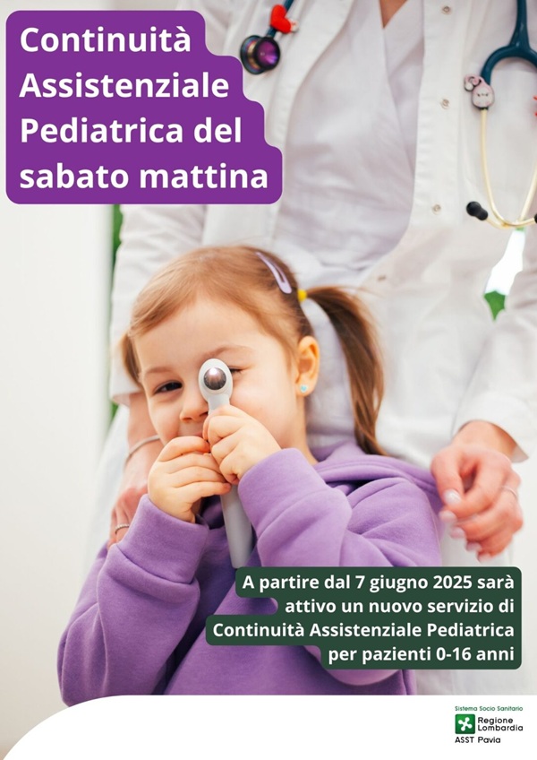 Si pubblica la locandina relativa all'apertura dell'Ambulatorio della Continuità Assistenziale Pediatrica del sabato mattina presso le Case di Comunità di Pavia, Vigevano e Voghera.