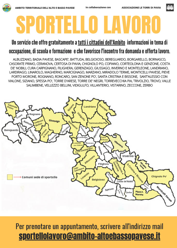 Lo Sportello Lavoro è un Servizio che si occupa di fornire gratuitamente a tutti i cittadini dell’Ambito Territoriale dell’Alto e Basso Pavese tutte le informazioni necessarie in tema di occupazione e di formazione, con la priorità di favorire l’incontro tra domanda e offerta di lavoro, agevolando così l’occupazione. È un servizio di riferimento per i cittadini, dove trovare un supporto informativo e di orientamento per affrontare in modo consapevole le scelte più opportune al proprio percorso professionale, per conoscere le opportunità di lavoro offerte dal territorio e per avviare una ricerca attiva del lavoro finalizzata all’inserimento/reinserimento nel mondo del lavoro.