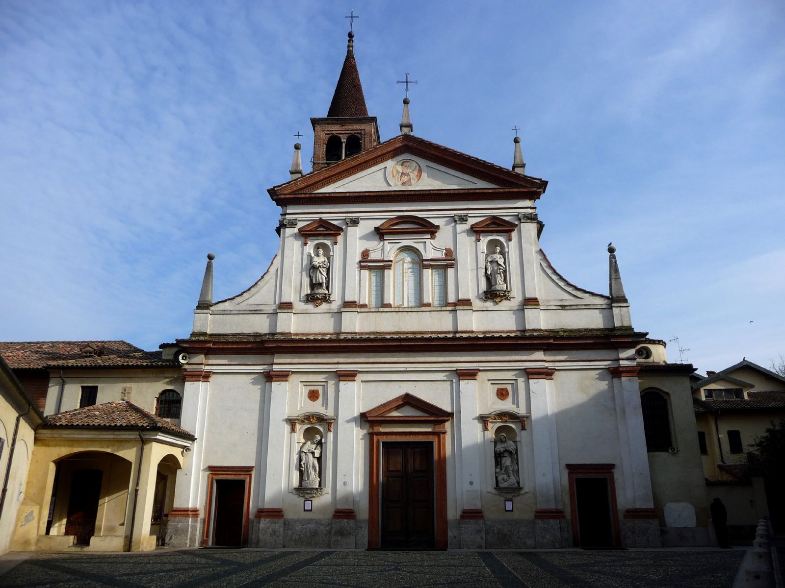 La chiesa attuale fu costruita verso il 1620 in sostituzione di una precedente, atterrata perchè in decadenza. Dell'antica chiesa demolita dai frati rimane il maestoso campanile del sec. XV, a guglia conica. Alto m40, 50, e` il più bello dei dintorni e costituisce il simbolo del paese, ben visibile anche da chi percorre l'autostrada. Nel 1897 il prevosto Merli lo doto` d'un concerto di otto campane. La guglia non e` quella originale, caduta il 6 agosto 1668 a causa d'un fulmine, che penetro` nella chiesa mentre si cantavano i vespri ed uccise un giovane, di nome Giuseppe Vai.